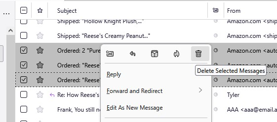 When I select emails to delete (move to Trash) Thunderbird deletes them BUT THEN automatically selects the next email in the list. If I don't notice that, and deselect it, that email gets deleted with the next batch. I've lost several emails this way. So, how do I get Thunderbird to stop selecting the next email after it deletes the ones that I selected. Nothing should be selected after an email is deleted. I don't see anything in the settings menu to do this. If this is a default feature, it's pretty dangerous and should be changed.