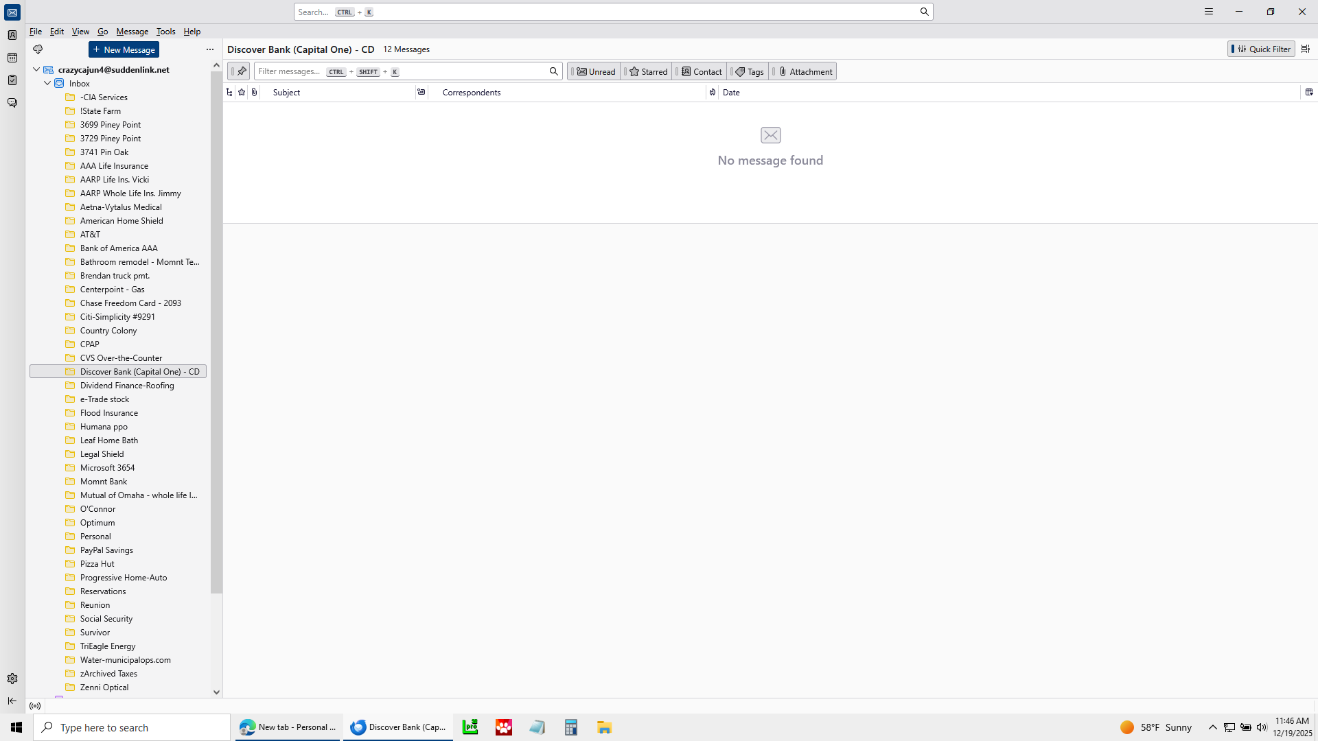 My guess is that the folder "Discover Bank" (respectively the mbox file Discover Bank) is corrupt. Do a R-click on Discover Bank > Properties .... and look up "Number of messages" and "Size on disk". You might find number of messages : 0 which in my experience means the mbox file is damaged. Do you have a backup copy of your Thunderbird profile?
