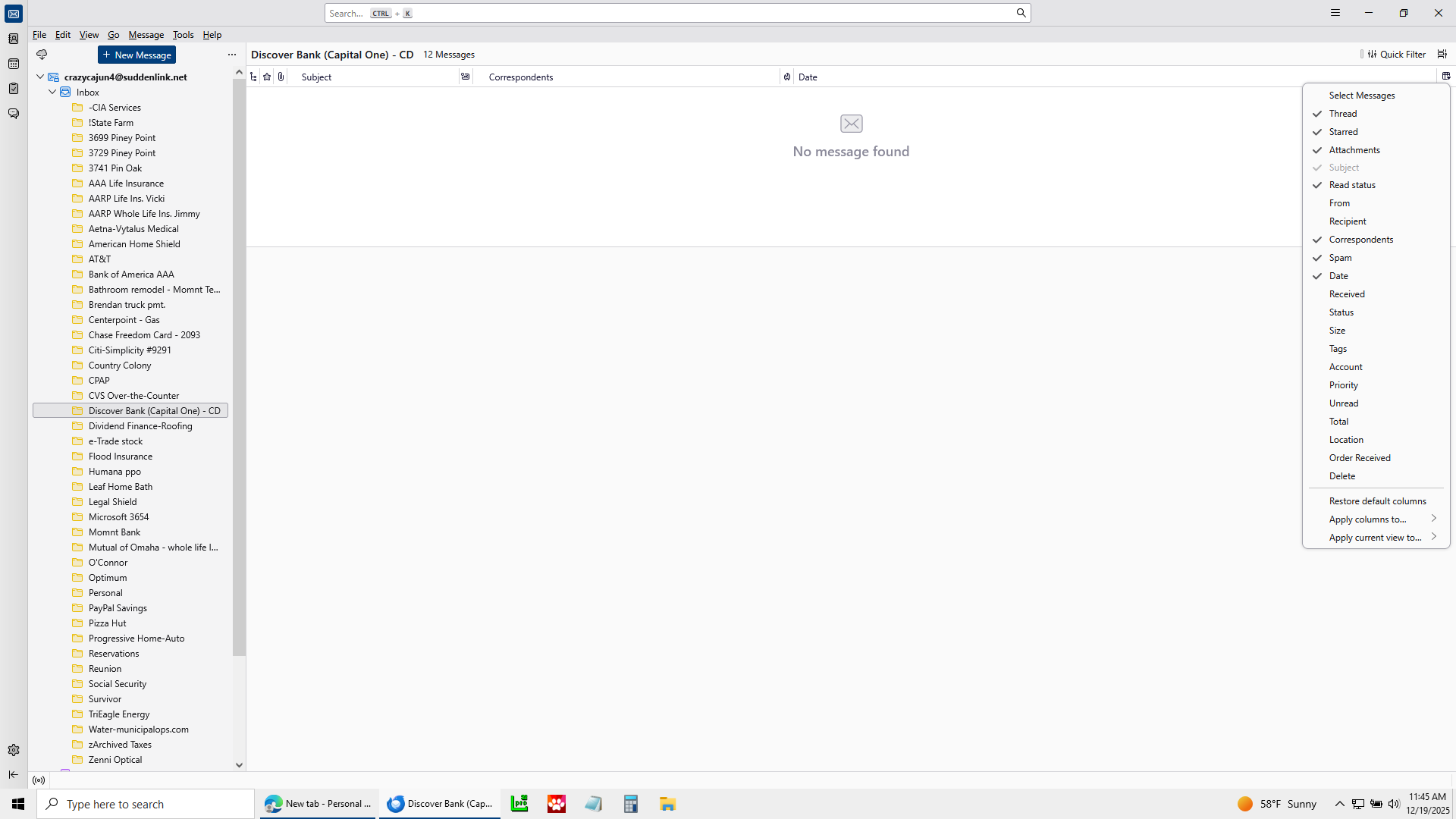If still no joy....Upload an image which shows : On the left - The Folder Pane and subfolder (select problem folder) - so we can see the hierachy On the right - The empty Message List of problem subfolder, with it's column headers. Enable the Quick Filter so we can see what if anything is selected or not.